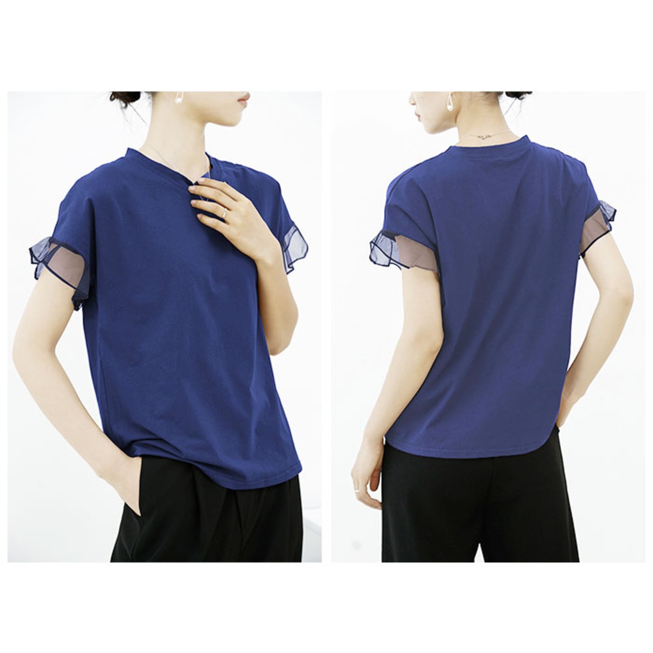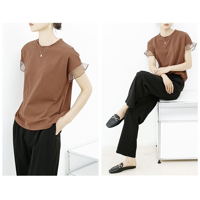 ・シースルー素材を使用したフリルの袖が女性らしい雰囲気。