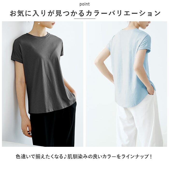 ・どんなボトムスとも合わせやすい、ワンカラーデザイン。半袖より短めのフレンチスリーブタイプ。