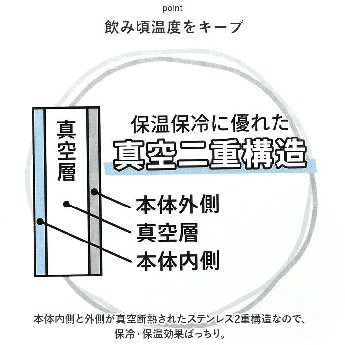 ・本体内側と外側が真空断熱されたステンレス2重構造なので、保冷・保温効果ばっちり。