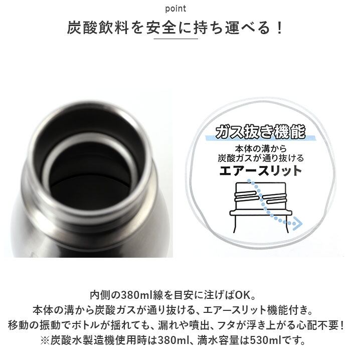 ・内側の380ml線を目安に注げばOK。本体の溝から炭酸ガスが通り抜ける、エアースリット機能付き。移動の振動でボトルが揺れても、漏れや噴出、フタが浮き上がる心配不要!(※炭酸水製造機使用時は380ml、満水容量は530mlです。)
