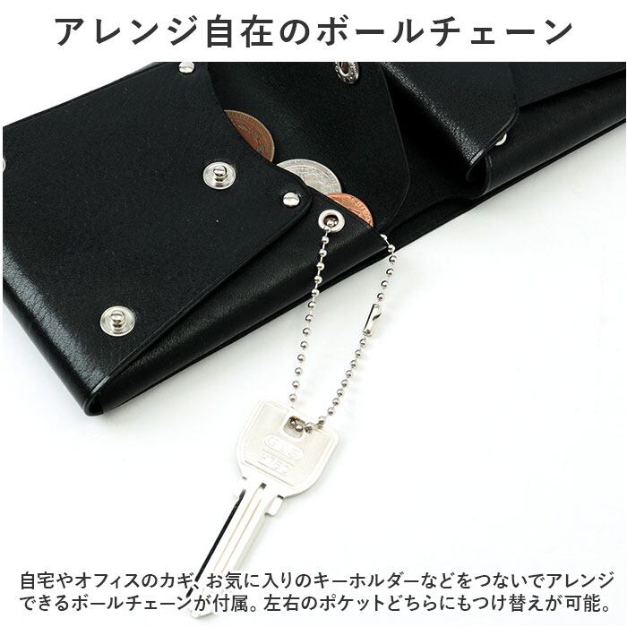 ・自宅やオフィスのカギ、お気に入りのキーホルダーなどをつないでアレンジできるボールチェーンが付属。左右のポケットどちらにもつけ替えが可能。