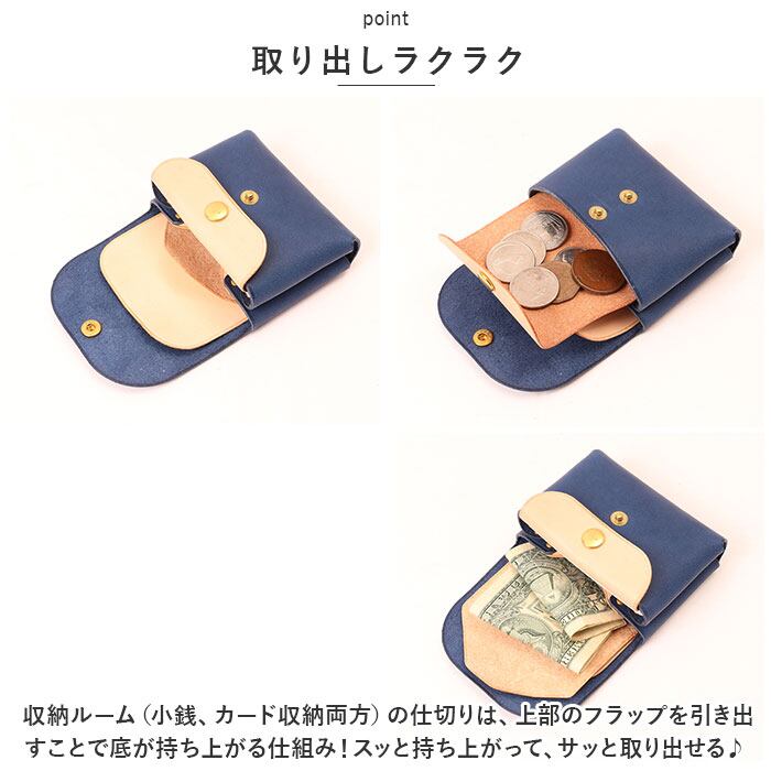 ・内側はスナップボタン式の小銭入れと、仕切られたルーム。最低限のクレジットカードや折り札、小銭を収納できて、キャッシュレス派におすすめ。