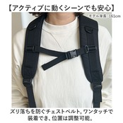 ・ズリ落ちを防ぐチェストベルト。ワンタッチで装着でき、位置は調整可能。