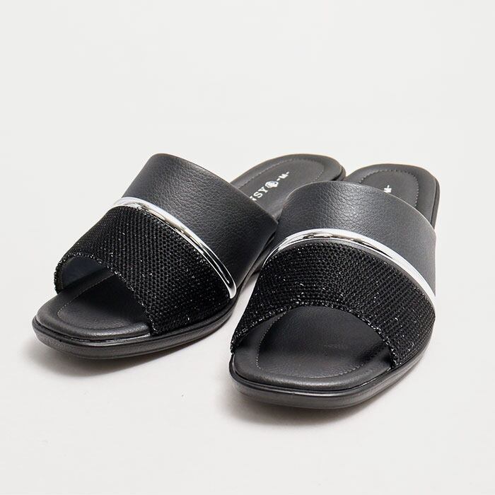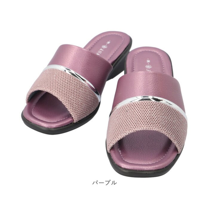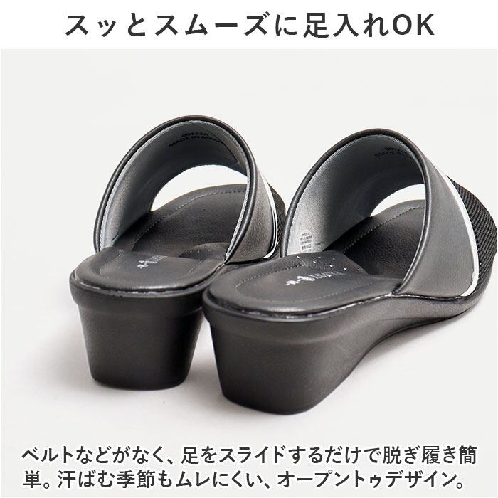 ・ベルトなどがなく、足をスライドするだけで脱ぎ履き簡単。汗ばむ季節もムレにくい、オープントゥデザイン。