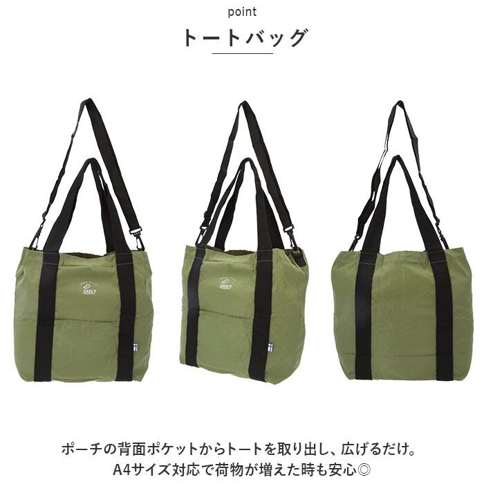 ・ポーチの背面ポケットからトートを取り出し、広げるだけ。A4サイズ対応で荷物が増えた時も安心◎