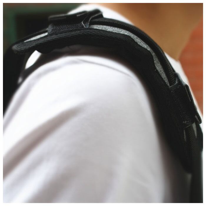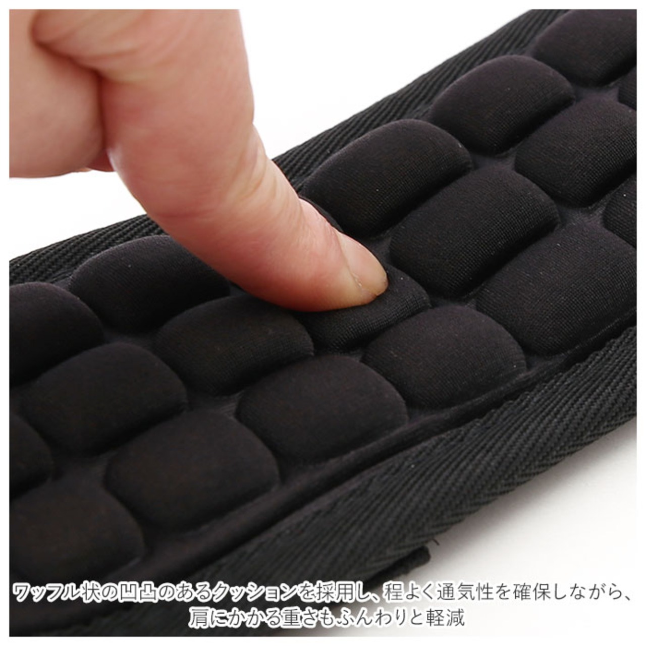 ・ワッフル状の凹凸のあるクッションを採用し、程よく通気性を確保しながら、肩にかかる重さもふんわりと軽減。