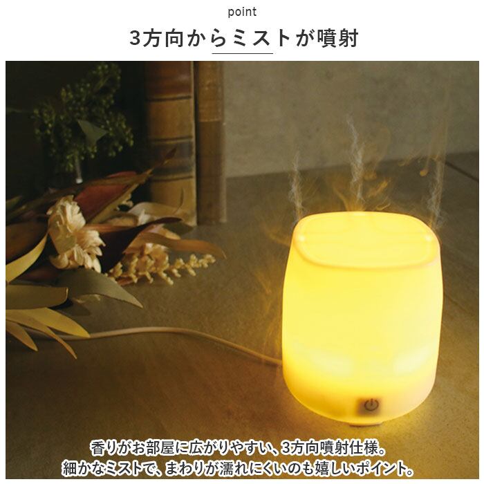 ・香りがお部屋に広がりやすい、3方向噴射仕様。細かなミストで、まわりが濡れにくいのも嬉しいポイント。