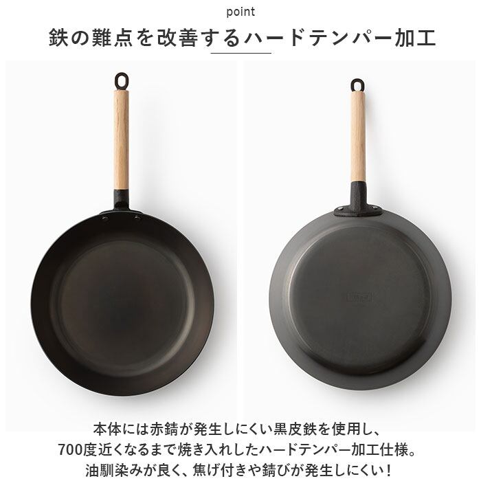 ・本体には赤錆が発生しにくい黒皮鉄を使用し、700度近くなるまで焼き入れしたハードテンパー加工仕様。油馴染みが良く、焦げ付きや錆びが発生しにくい!