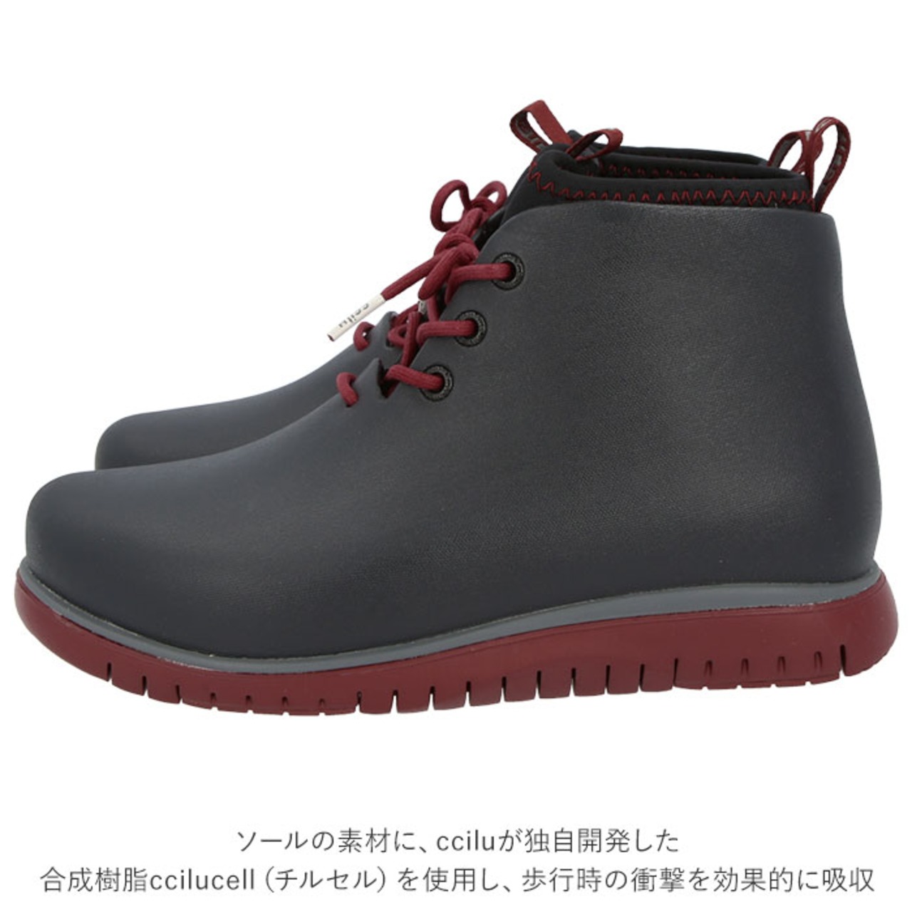 ・ソールの素材に、cciluが独自開発した合成樹脂ccilucell(チルセル)を使用し、歩行時の衝撃を効果的に吸収。