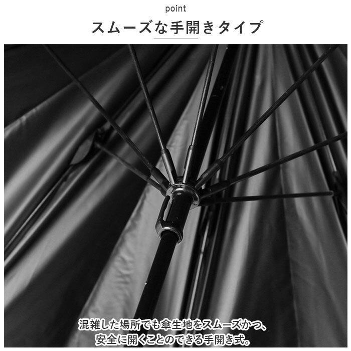 ・混雑した場所でも傘生地をスムーズかつ、安全に開くことのできる手開き式。