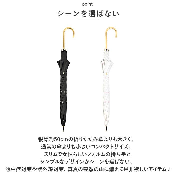 ・親骨約50cmの折りたたみ傘よりも大きく、通常の傘よりも小さいコンパクトサイズ。スリムで女性らしいフォルムの持ち手とシンプルなデザインがシーンを選ばない。熱中症対策や紫外線対策、真夏の突然の雨に備えて是非欲しいアイテム♪