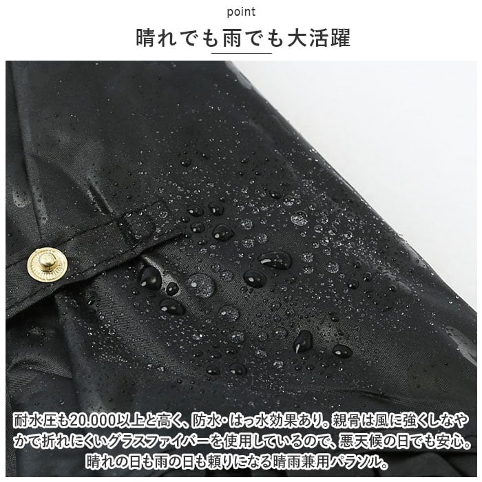 ・耐水圧も20.000以上と高く、防水・はっ水効果あり。親骨は風に強くしなやかで折れにくいグラスファイバーを使用しているので、悪天候の日でも安心。晴れの日も雨の日も頼りになる晴雨兼用パラソル。