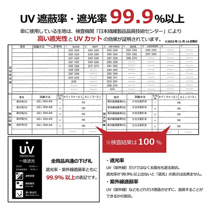 ・強い日射しや太陽からの熱をしっかりと遮る「遮光率99.99%」、「紫外線遮蔽率99.9%以上」の一級遮光生地を採用し、傘の下はまるで木陰のような涼しさ。(※遮蔽率や遮光率は製品のデザインや使用環境により異なります。)