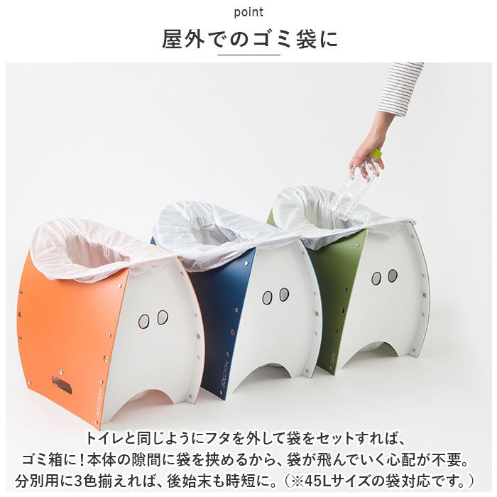 ・トイレと同じようにフタを外して袋をセットすれば、ゴミ箱に!本体の隙間に袋を挟めるから、袋が飛んでいく心配が不要。分別用に3色揃えれば、後始末も時短に。(※45Lサイズの袋対応です。)
