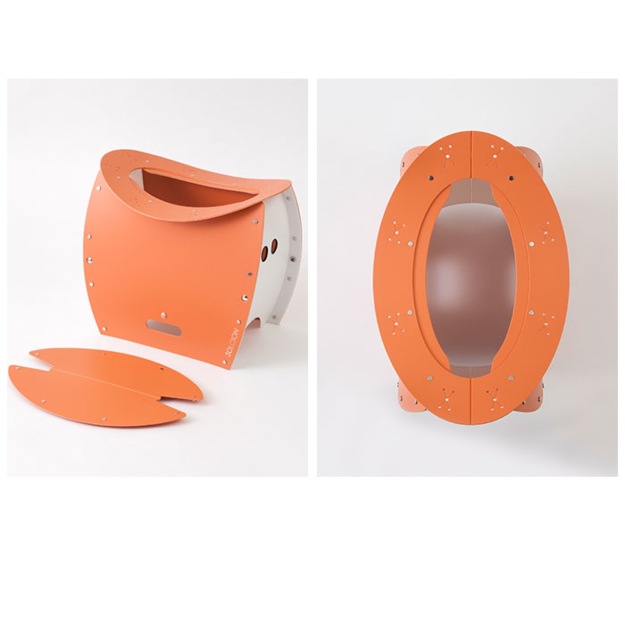 ・1枚目の座面を取り外し、中央に穴の開いた2枚目の座面に袋をセット。座面を外しても十分な強度があり、非常時に使える簡易トイレに変身!(※間口65cm以上の袋をご使用ください。)