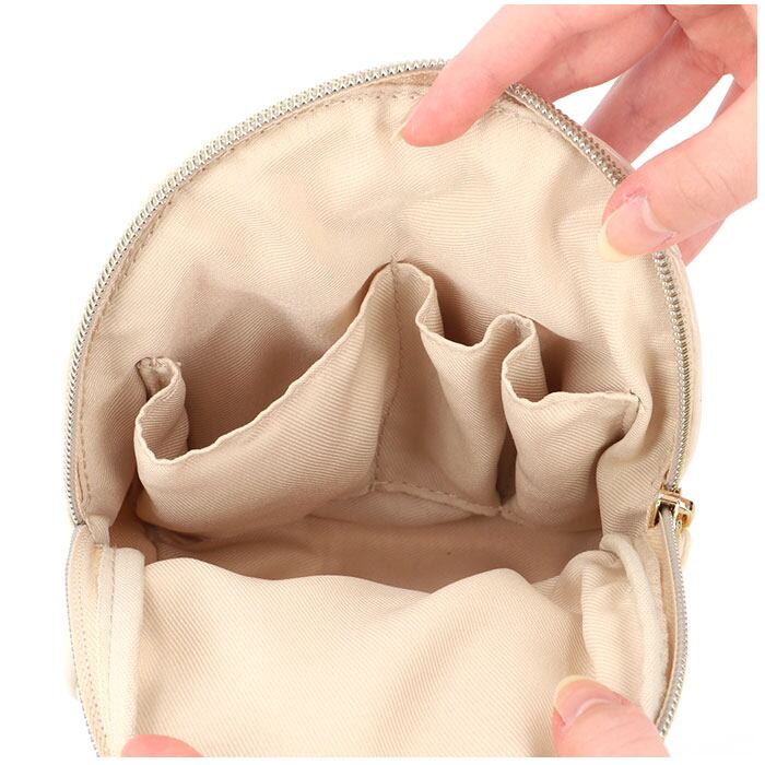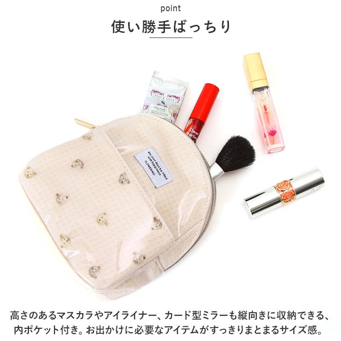 ・高さのあるマスカラやアイライナー、カード型ミラーも縦向きに収納できる、内ポケット付き。お出かけに必要なアイテムがすっきりまとまるサイズ感。