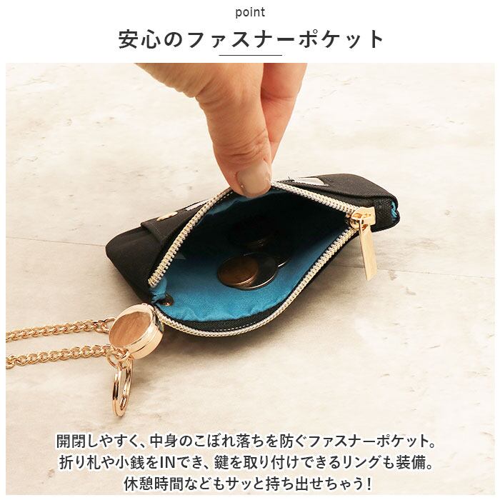 ・開閉しやすく、中身のこぼれ落ちを防ぐファスナーポケット。折り札や小銭をINでき、鍵を取り付けできるリングも装備。休憩時間などもサッと持ち出せちゃう!