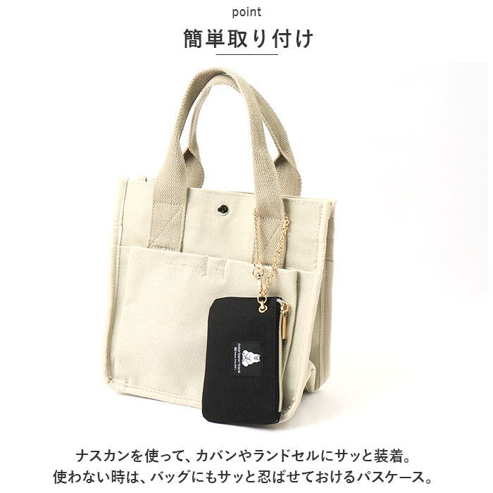 ・ナスカンを使って、カバンやランドセルにサッと装着。使わない時は、バッグにもサッと忍ばせておけるパスケース。