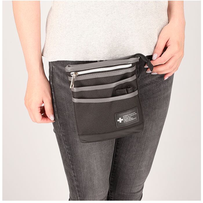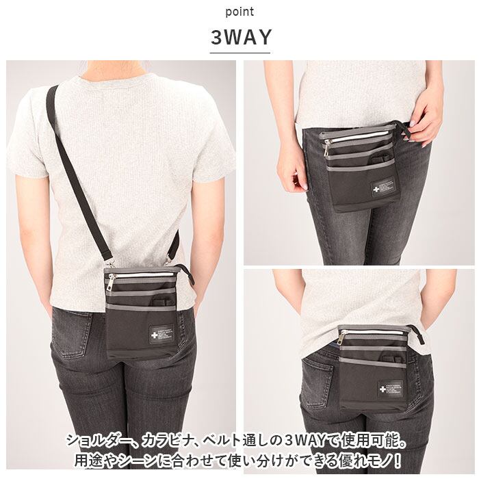 ・ショルダー、カラビナ、ベルト通しの3WAYで使用可能。用途やシーンに合わせて使い分けができる優れモノ!