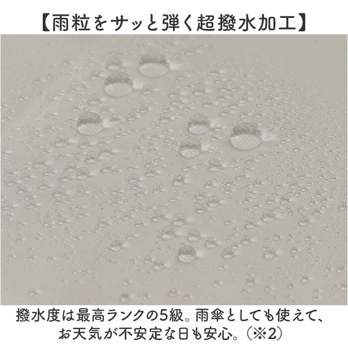 ・撥水度は最高ランクの5級。雨傘としても使えて、お天気が不安定な日も安心。