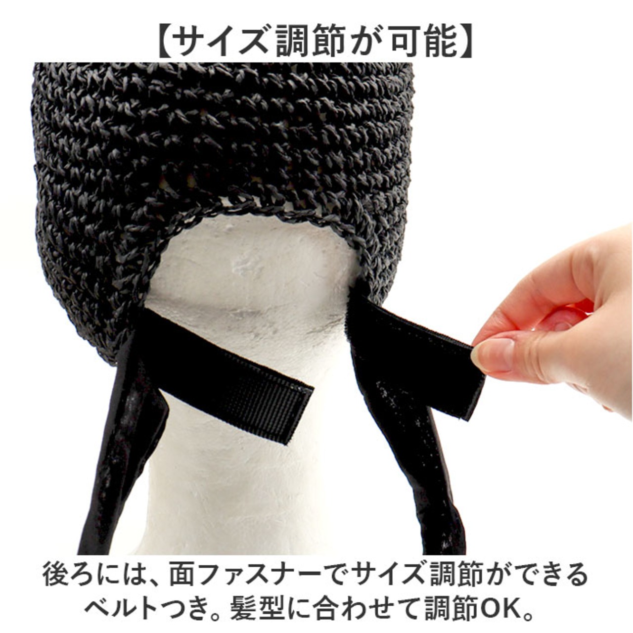 ・後ろには、面ファスナーでサイズ調節ができるベルトつき。髪型に合わせて調節OK。