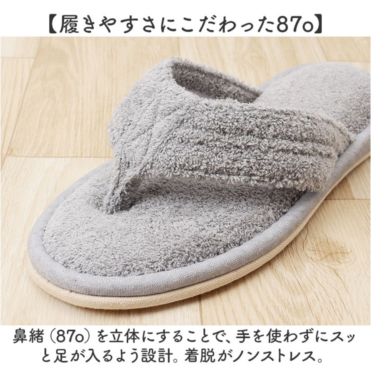 ・鼻緒(87o)を立体にすることで、手を使わずにスッと足が入るよう設計。着脱がノンストレス。