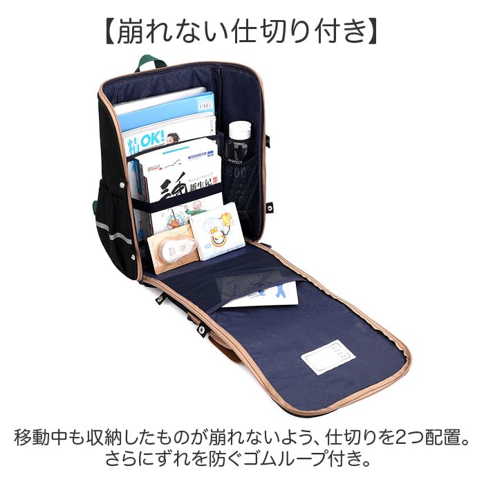 ・移動中も収納したものが崩れないよう、仕切りを2つ配置。さらにずれを防ぐゴムループ付き。