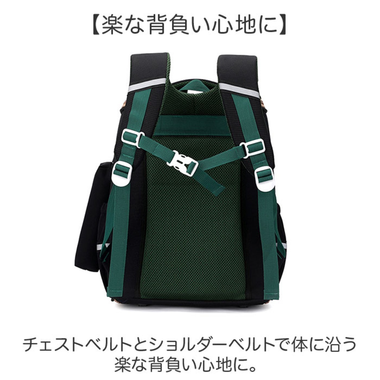 ・チェストベルトとショルダーベルトで体に沿う楽な背負い心地に。