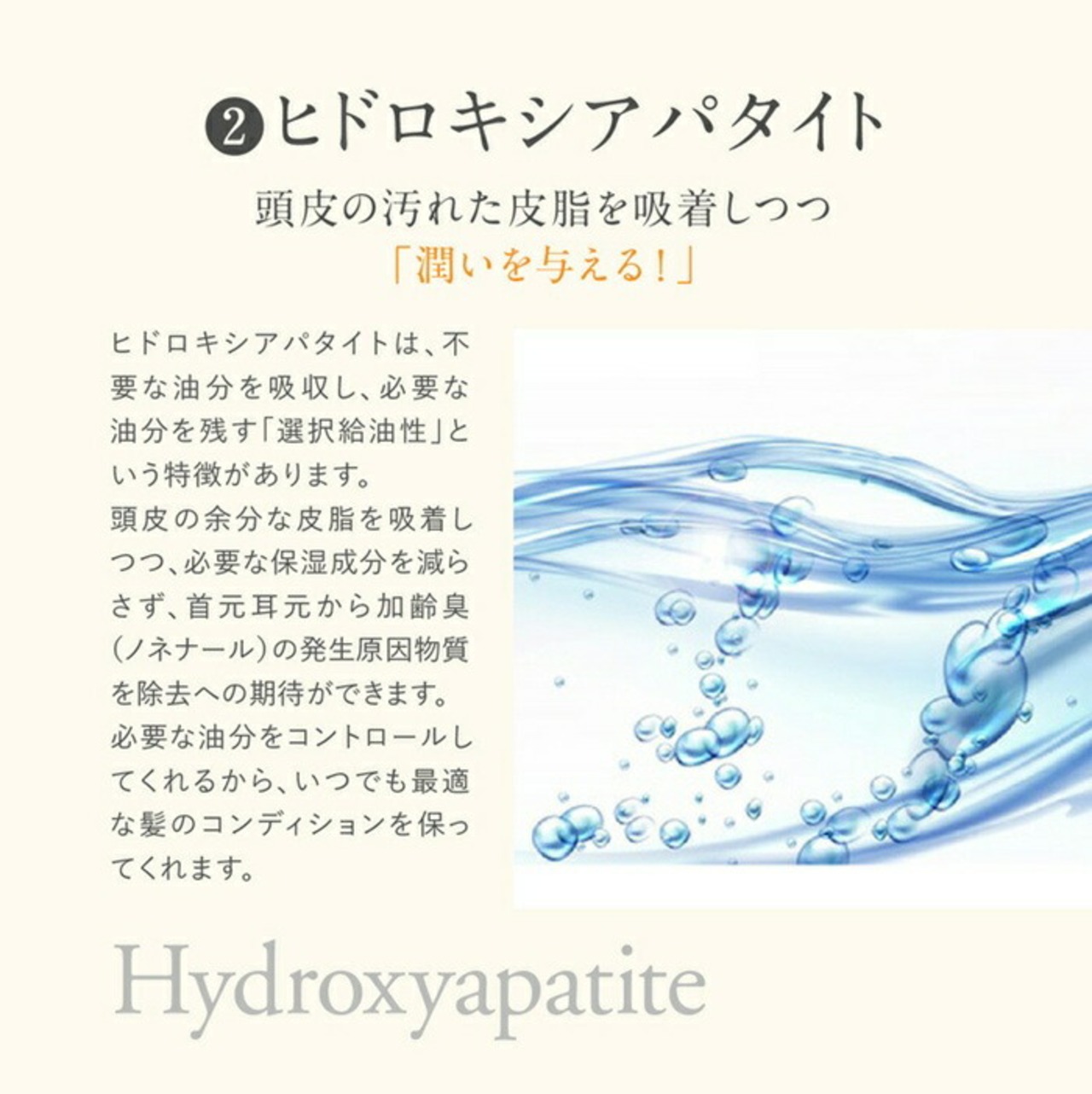 水、セテアリルアルコール、グリセリン、トリエチルヘキサノイン、ベヘントリモニウムクロリド、セタノール、ソルビトール、ヒドロキシアパタイト、カオリン、へマチン、バオバブ種子油、ホホバ種子油、スクワラン、オリーブ果実油、ゴマ油、ヒマワリ種子油、ヤシ油、アーモンド油、ベルガモット果実油、マンダリンオレンジ果皮エキス、水溶性プロテオグリカン、加水分解コンキオリン、アルニカ花エキス、オドリコソウ花エキス、オランダガラシ葉/茎エキス、ゴボウ根エキス、セイヨウキズタ葉/茎エキス、ニンニク根エキス、セイヨウアカマツ球果エキス、ローズマリー葉エキス、ローマカミツレ花エキス、ヒバマタエキス、スサビノリエキス、サガラメエキス、デシルグルコシド、カプリリルグリコール、メントール、イソプロパノール、クエン酸、EDTA?2Na、BG、香料、パルミチン酸エチルヘキシル、フェノキシエタノール