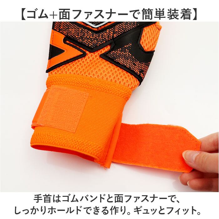 ・手首はゴムバンドと面ファスナーで、しっかりホールドできる作り。ギュッとフィット。