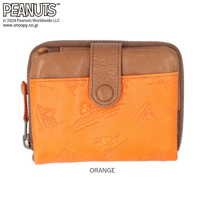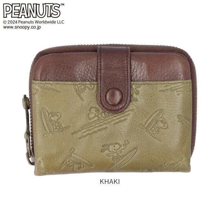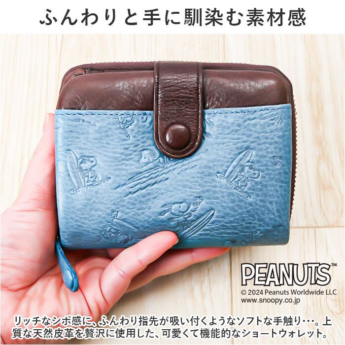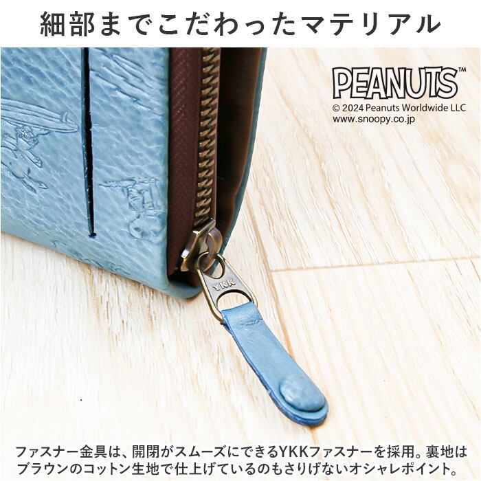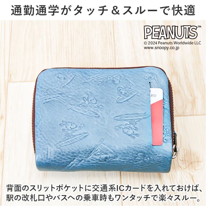 ・大人から子どもまで世界中から愛されるPEANUTSアートを大人の革小物にアレンジ。サーフボードにのって楽し気に波を乗りこなす、スヌーピーのイラストを型押しした遊び心あふれるデザイン。