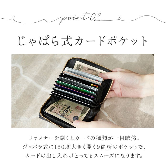 ・ジャバラが180度に大きく開くので、必要なカードが一目で分かり、取り出しやすいのも嬉しいポイント。