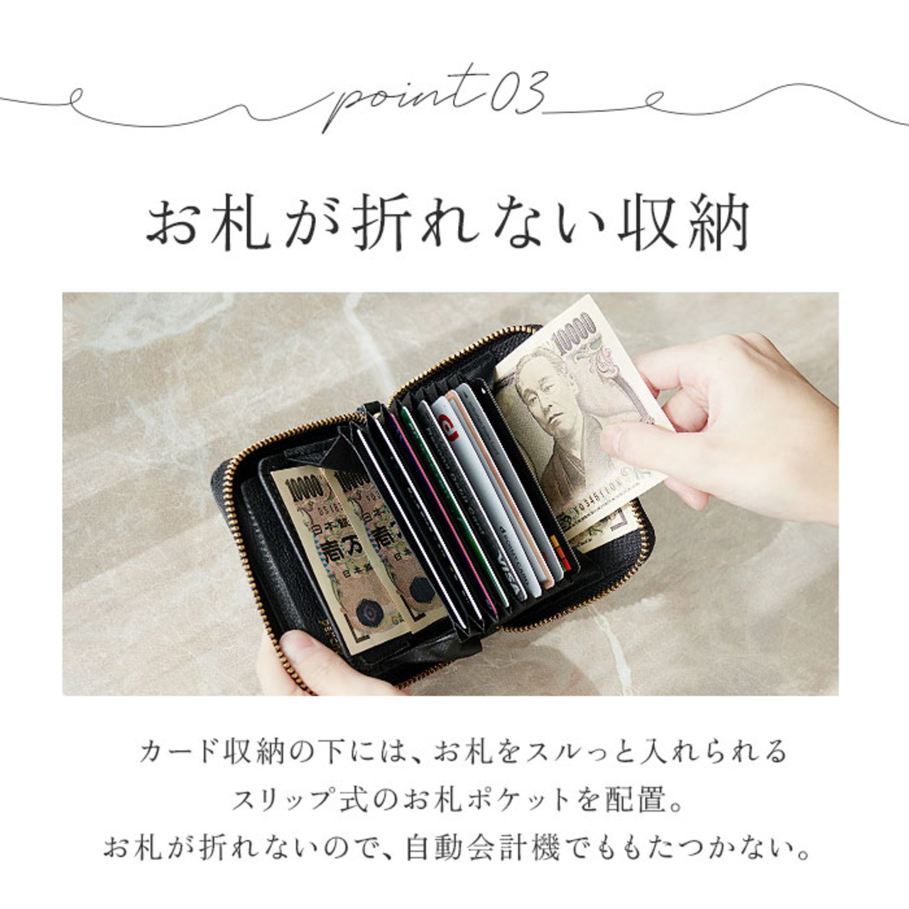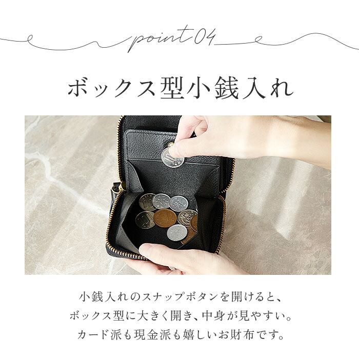 ・独立したボックス型の小銭入れと、お札を折らずに収納ができるスリップ式のお札入れ付き。現金派の方にもピッタリなアイテム。