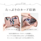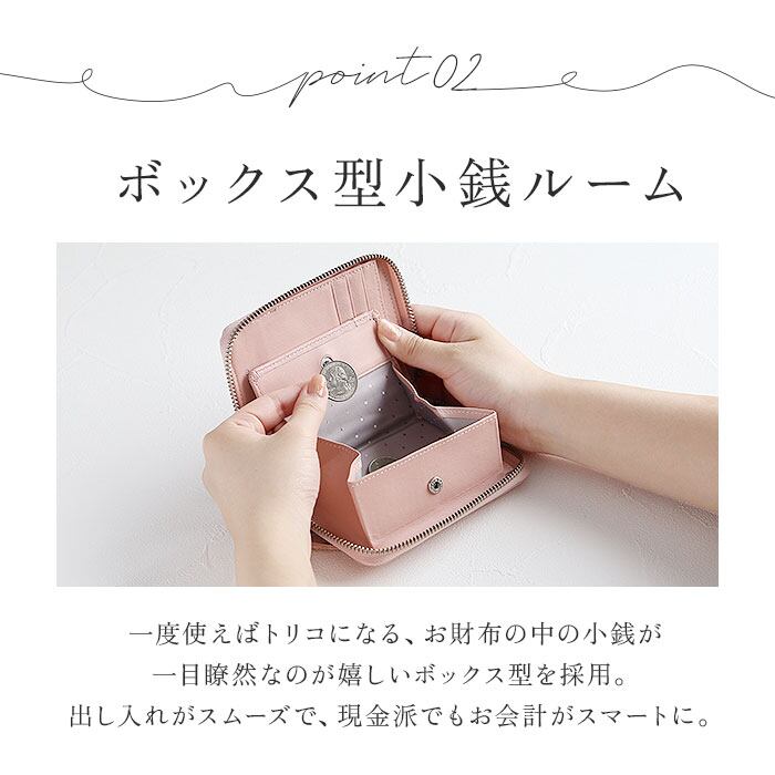 ・各収納ルームとポケットの内生地にはサラッと滑りやすい素材を使用。背面の切り込みやボックス型の小銭入れ等、取り出しやすい工夫が沢山!