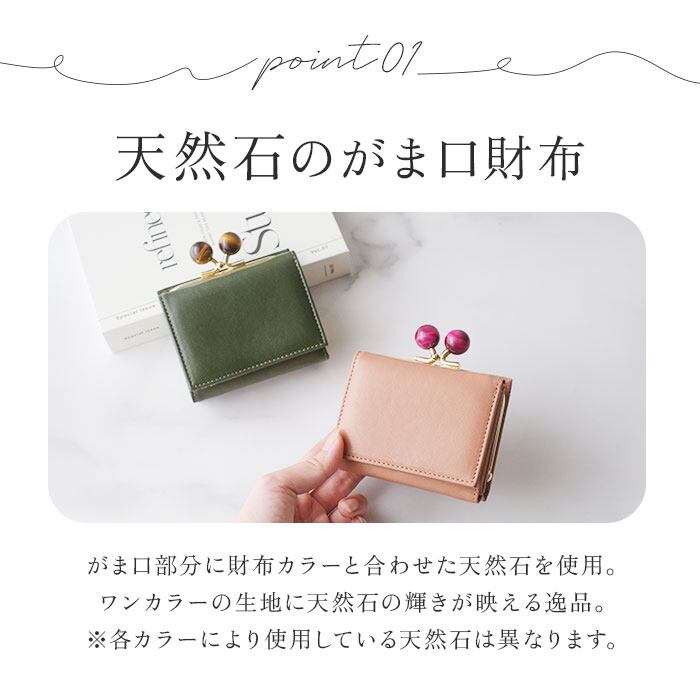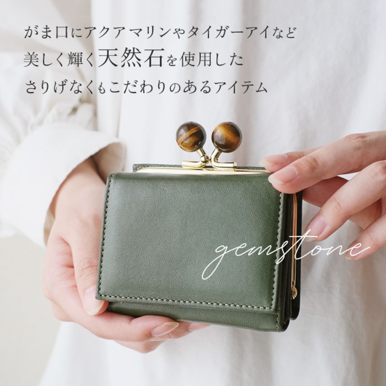 ・がま口開口部分にアクアマリンやタイガーアイなど天然石を使用。ワンカラーの生地に天然石の輝きやカラーが映える逸品。(※各カラーにより使用している天然石は異なります。予めご了承ください。)