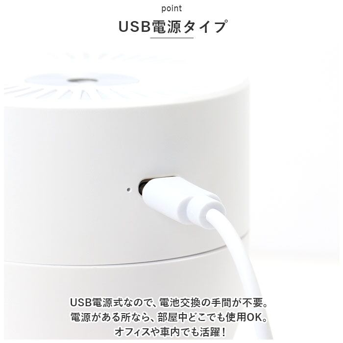 ・USB電源式なので、電池交換の手間が不要。電源がある所なら、部屋中どこでも使用OK。オフィスや車内でも活躍!