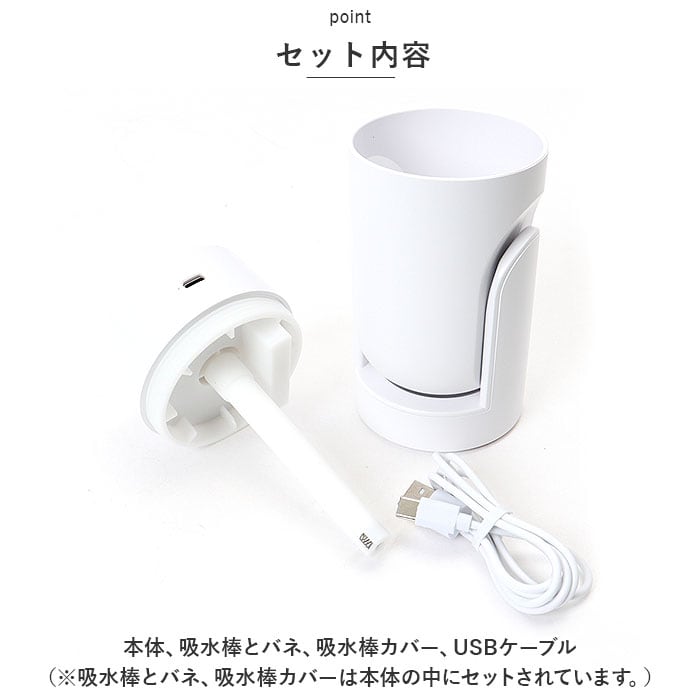 ・本体、吸水棒とバネ、吸水棒カバー、USBケーブル(※吸水棒とバネ、吸水棒カバーは本体の中にセットされています。)