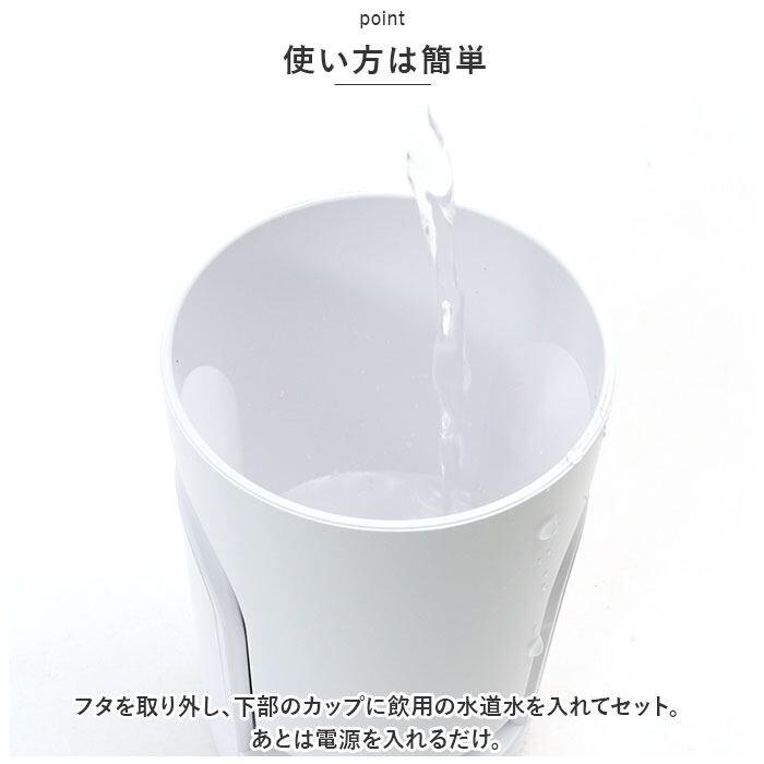 ・フタを取り外し、下部のカップに飲用の水道水を入れてセット。あとは電源を入れるだけ。