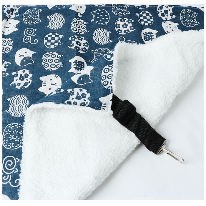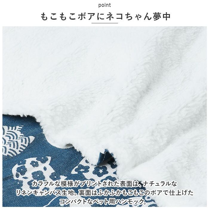 ・カラフルな模様がプリントされた表面は、ナチュラルなリネンキャンバス生地。裏面はふかふかもこもこのボアで仕上げたコンパクトなペット用ハンモック。