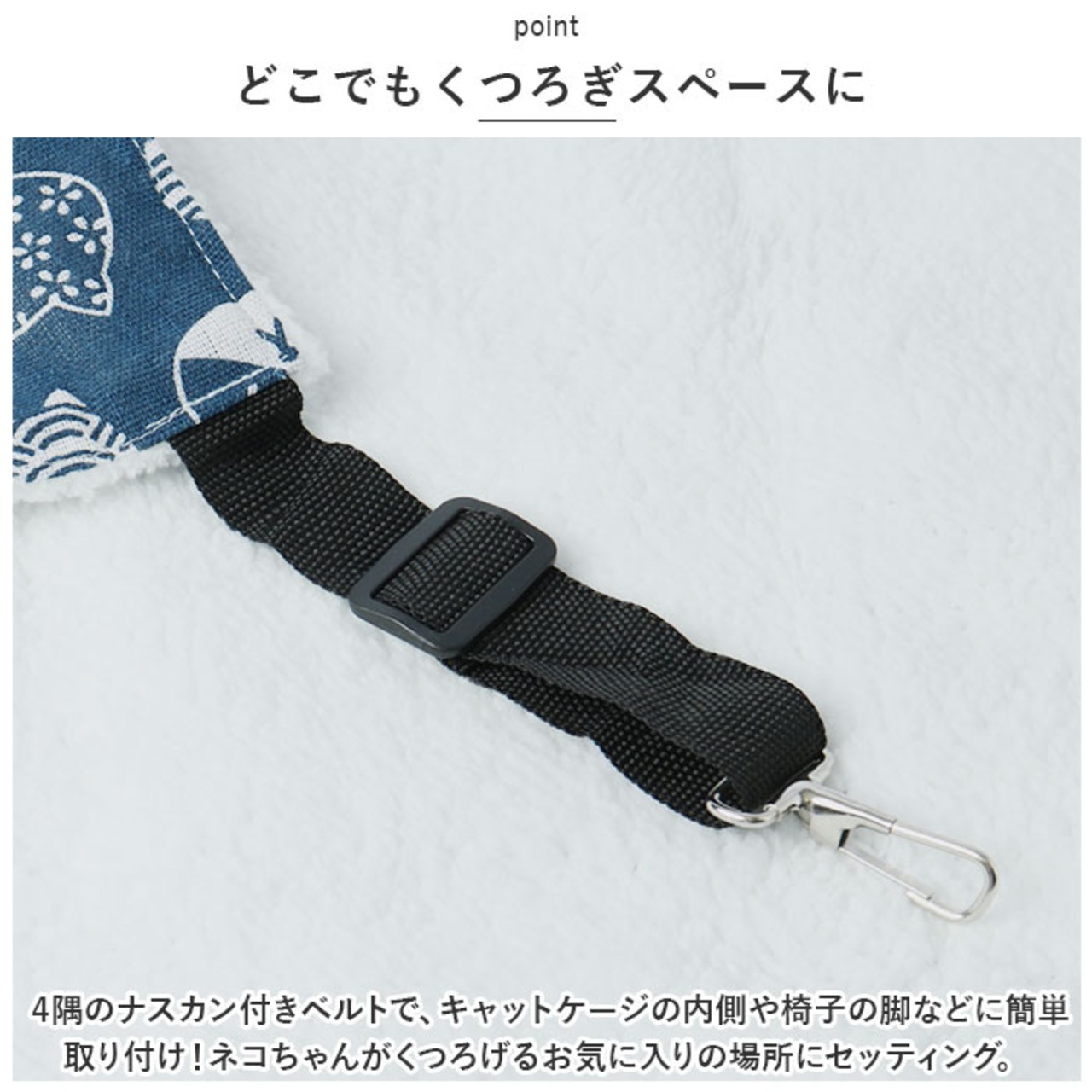4隅のナスカン付きベルトで、キャットケージの内側や椅子の脚などに簡単取り付け!ネコちゃんがくつろげるお気に入りの場所にセッティング。