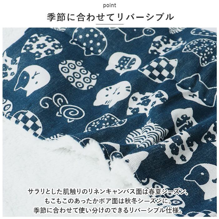 ・サラリとした肌触りのリネンキャンバス面は春夏シーズン、もこもこのあったかボア面は秋冬シーズンに。季節に合わせて使い分けのできるリバーシブル仕様。
