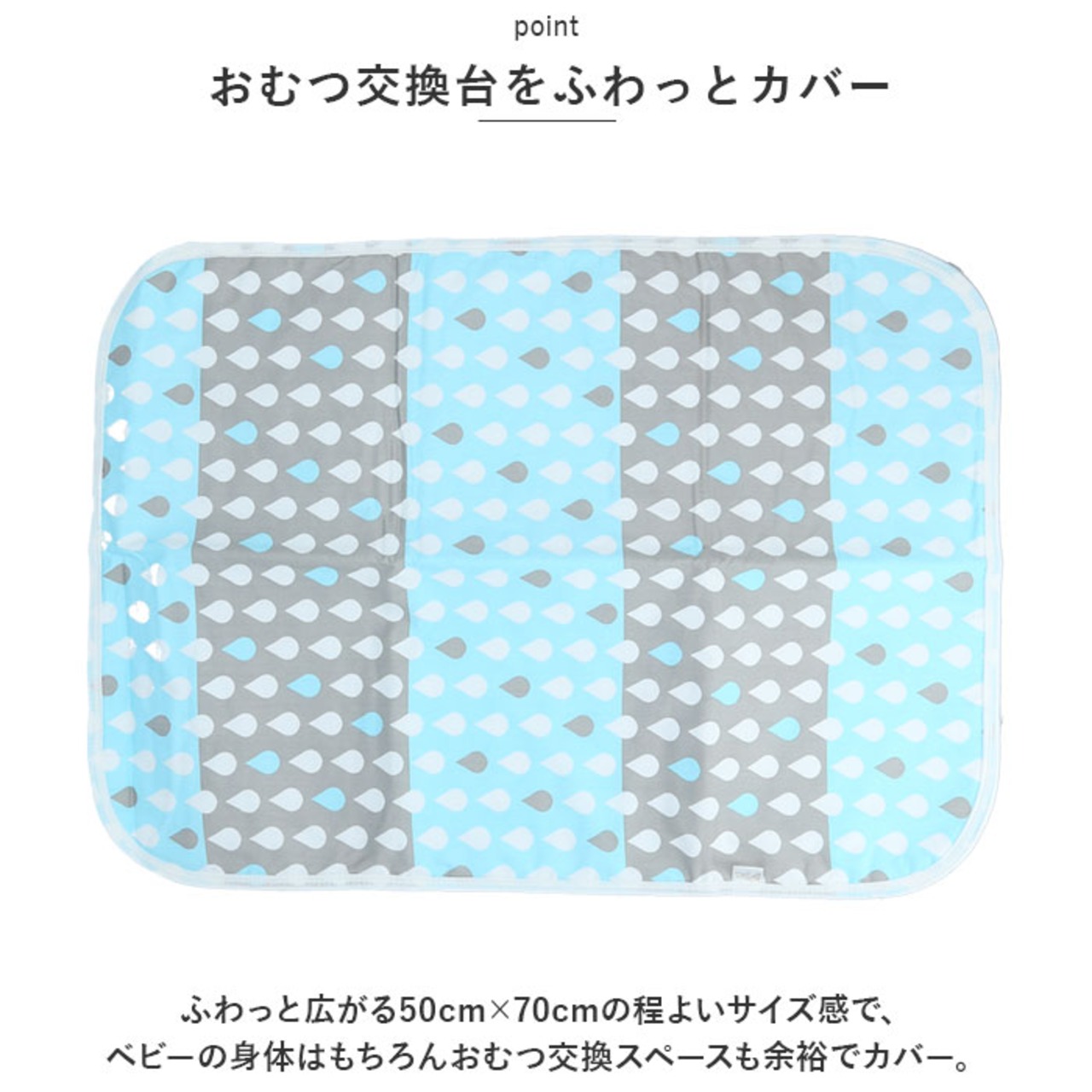 ・ふわっと広がる50cm×70cmの程よいサイズ感で、ベビーの身体はもちろんおむつ交換スペースも余裕でカバー。