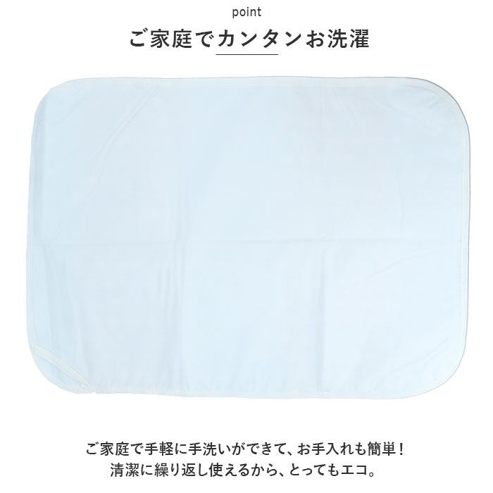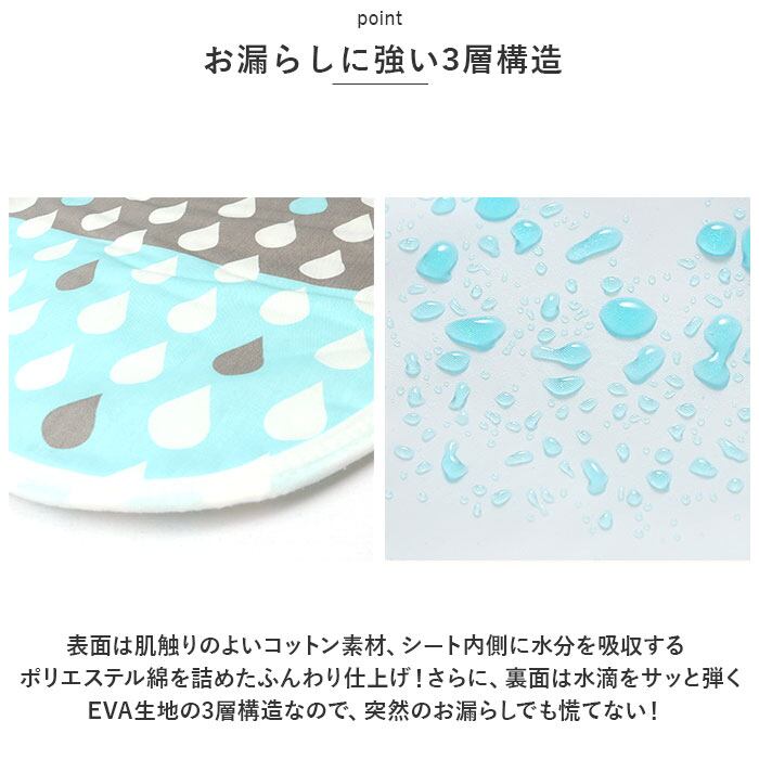 ・表面は肌触りのよいコットン素材、シート内側に水分を吸収するポリエステル綿を詰めたふんわり仕上げ!さらに、裏面は水滴をサッと弾くEVA生地の3層構造なので、突然のお漏らしでも慌てない!