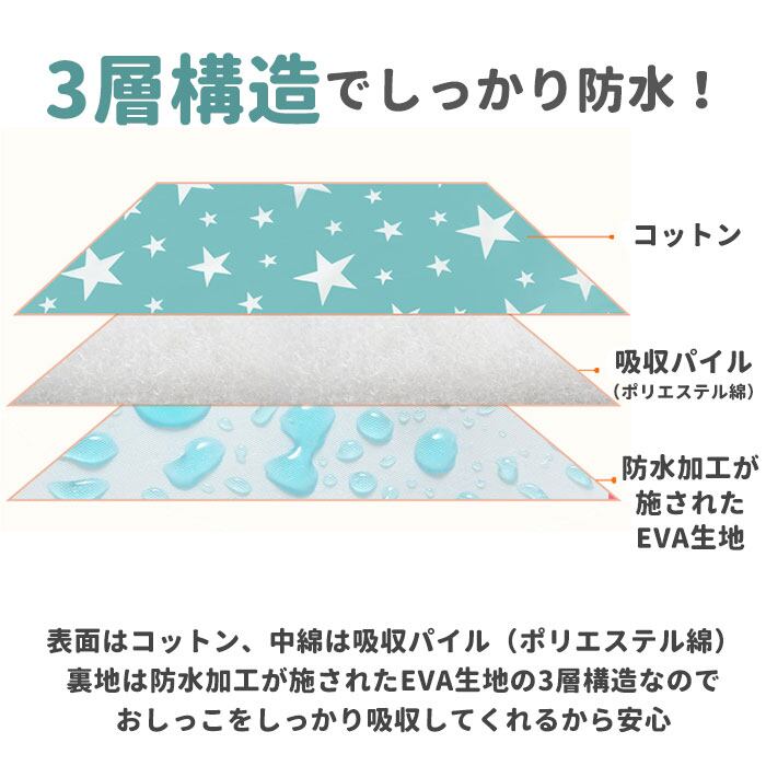 ・表面は肌触りのよいコットン素材、マット内側に水分を吸収するポリエステル綿を詰めたふんわり仕上げ!さらに、裏面は水滴をサッと弾くEVA生地の3層構造なので、ワンちゃんが急にお漏らしをしてしまっても大丈夫。