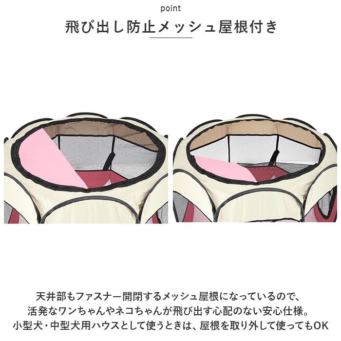 ・天井部もファスナー開閉するメッシュ屋根になっているので、活発なワンちゃんやネコちゃんが飛び出す心配のない安心仕様。小型犬・中型犬用ハウスとして使うときは、屋根を取り外して使ってもOK!