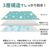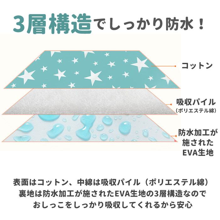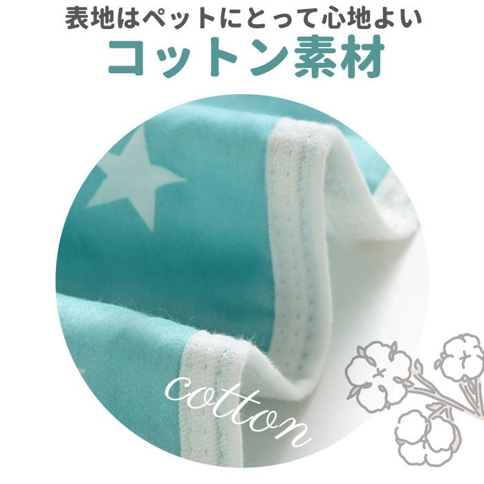 ・表面は肌触りのよいコットン素材、マット内側に水分を吸収するポリエステル綿を詰めたふんわり仕上げ!さらに、裏面は水滴をサッと弾くEVA生地の3層構造なので、ワンちゃんが急にお漏らしをしてしまっても大丈夫。