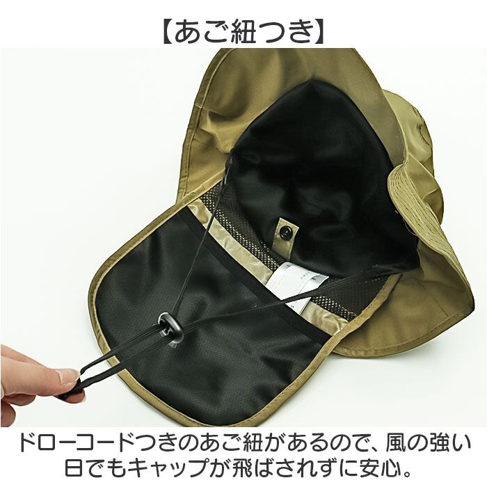 ・ドローコードつきのあご紐があるので、風の強い日でもキャップが飛ばされずに安心。