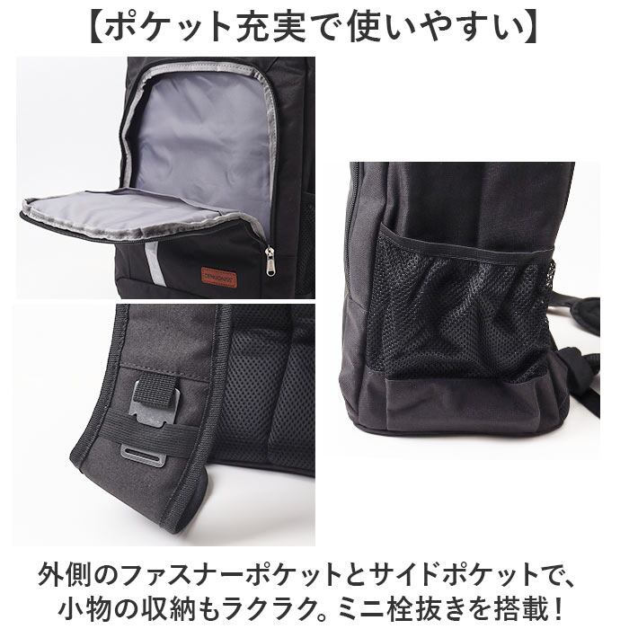 ・外側のファスナーポケットとサイドポケットで、小物の収納もラクラク。ミニ栓抜きを搭載!