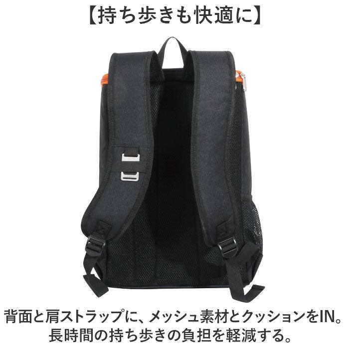 ・背面と肩ストラップに、メッシュ素材とクッションをIN。長時間の持ち歩きの負担を軽減する。