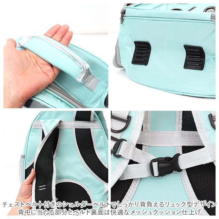 ・チェストベルト付きのショルダーベルトでしっかり背負えるリュック型デザイン。背中に当たる部分とベルト裏面は快適なメッシュクッションで仕上げ、飼い主さんの身体への負担も優しく軽減。
